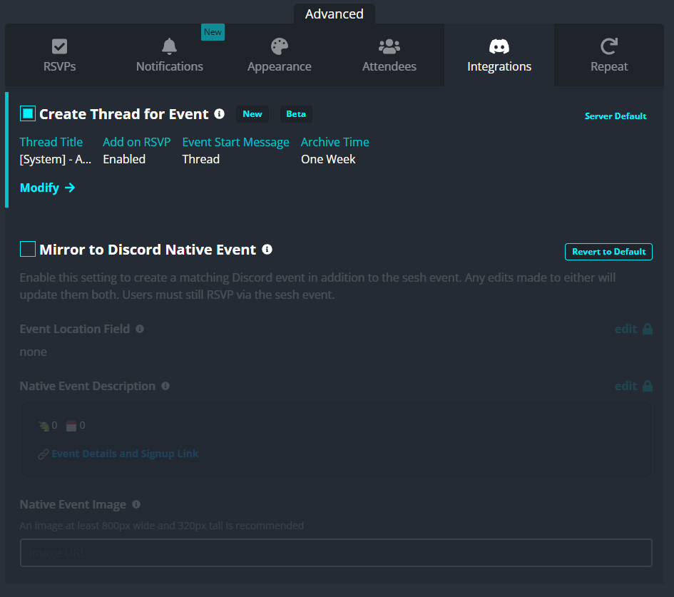 Auf dem Reiter Integrations lässt sich der temporäre Thread für den Event und der Abgleich mit den Discord-eigenen Veranstaltungen deaktivieren bzw. bearbeiten.